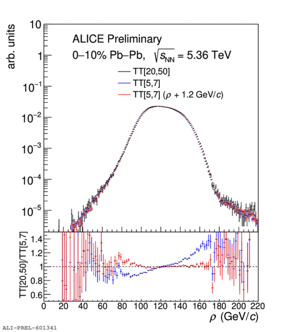 Distribution of rho in signal events (black), reference events (blue) and 1.2 GeV/c shifted reference events (red)