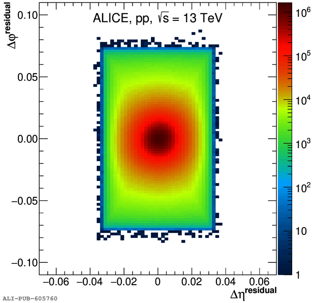 Distance between a cluster and the closest projected track in $\eta$~(left) or $\varphi$ angle~(middle) versus the track momentum and for matched track-cluster pairs~(right) in pp collisions at \sthirteen\ collected with the minimum bias trigger. Clusters are reconstructed using the V2 clusterizer. The black lines in the left and middle panels indicate the suggested selection criteria expressed in \Eq{Eq:TMVetoCriteria}.
