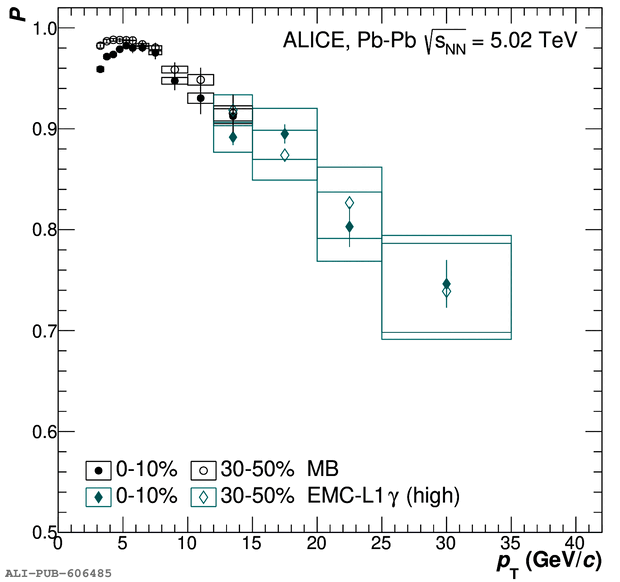 Data-driven purity ($P$) estimates of the electron sample after applying \gls{TPC} and \gls{EMCal} electron identification criteria as a function of \pT\ in \pp\ collisions at \sthirteen\ (left) and in \PbPb\ collisions at \sfivelead\ (right). The boxes indicate the systematic uncertainty arising from the use of different scaling ranges for the hadronic background.