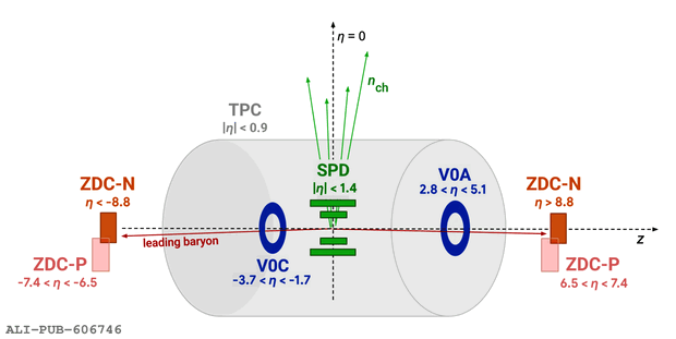 Illustration of the relative positions and pseudorapidity coverage of the SPD, TPC, ZDC-N, ZDC-P and V0 detectors used in this study. Dimensions are not to scale.