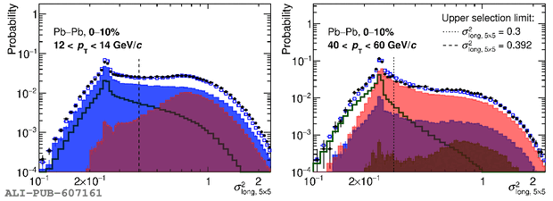 \ Inclusive-cluster \sigmalongPb\ distribution in data (black bullets) and PYTHIA~8 simulation (jet--jet+$\gamma$--jet processes, blue squares). The four panels display these distributions for two selected cluster \pt\ ranges, $12\pt14$~\GeVc on the left and $40\pt60$~\GeVc on the right, and two collision systems: \pp (top) and \PbPb 0--10\% central (bottom). The simulation is decomposed in its different particle origins: prompt $\gamma$ ($\gamma^{\rm prompt}$, green line), not merged decay $\gamma$ ($\gamma^{\rm decay}$, blue area), merged decay photon clusters ($\gamma\gamma$) from \piz (red area) or $\eta$ (brown area) The threshold value $\sigmalongPb~=~0.3$ or 0.392 (corresponding to $\sigma_{\rm max}^{2}$(13~\GeVc)) is shown on all plots as a dotted or dashed vertical line, respectively.