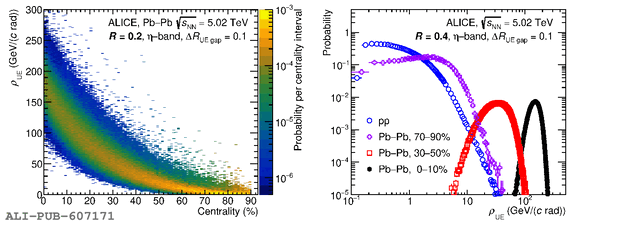 \ $\rho^{\rm UE}$ distributions normalised by the number of events in each centrality class in data calculated in the $\eta$-band with $\Delta R_{\rm UE~gap}=0.1$ out of an isolation cone centred at inclusive clusters with $\pt~>~10$~\GeVc. Left: for \PbPb collisions and the cone radius $R=0.2$ as a function of centrality. Right: for \pp and \PbPb collisions for different centrality classes for the cone radius $R=0.4$.