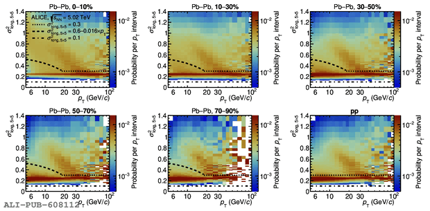 \ Inclusive-cluster \sigmalongPb\ distribution (basic cluster selection plus track--cluster association rejection for \PbPb collisions, see Sect.~3.2 of Ref.~) as a function of \pt\ in data for \pp (lower right frame) and \PbPb collisions for five different centrality classes. The dotted line corresponds to the tight value of the upper selection limit for single photon candidate clusters (narrow clusters) at $\sigma_{\rm max}^{2} = 0.3$. The dashed line corresponds to a looser photon upper selection used in \PbPb collisions below 18~\GeVc at $\sigma_{\rm max}^{2}(\pt)=0.6-0.016\times \pt$. The dotted-dashed line corresponds to the narrow cluster's lower limit at $\sigma_{\rm min}^{2} = 0.1$.