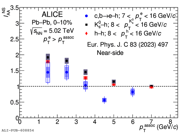 $I_{\rm{AA}}$ of NS (left) and AS (right) associated peak yield from correlation distributions of electron from heavy-flavor hadron decays as the trigger particle ($7 p_\text{T}^\text{e} 16$~\GeVc) compared with that of charged hadrons and $\mathrm{K}^{0}_\mathrm{S}$ as trigger particles ($8 \pt^{\rm{trig}} 16$~\GeVc~).