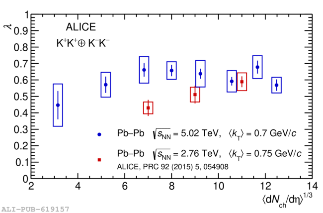 1D radii (left) and $\lambda$ parameters (right) as a function of the cube root of the charged-particle multiplicity density $\langle {\rm d}N_{\rm ch}/{\rm d}\eta \rangle^{1/3}$ in the high $k_\mathrm{T}$ range compared with results obtained in Pb--Pb collisions at \mbox{$\sqrt{s_{\rm NN}} = 2.76$}~TeV~. Statistical uncertainties are shown as bars, and systematic uncertainties are shown as boxes \.